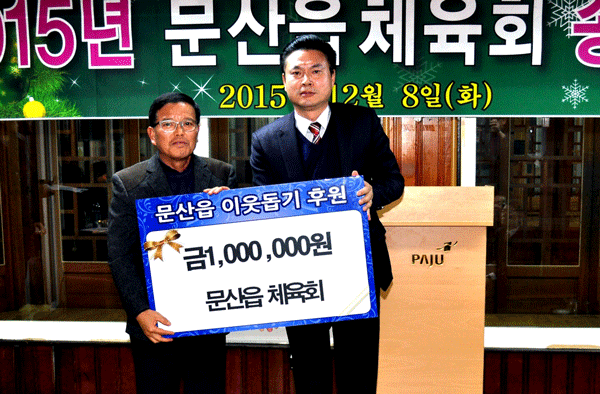 파주시 문산읍 체육회는 8일 체육회 송년의 밤을 통해 관내 저소득 가구를 위한 불우이웃돕기 성금 100만원을 문산읍에 전달했다.