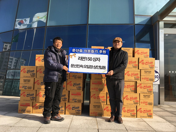 파주시 문산민속오일장상인회(공동대표 김종인, 안석균)는 4일 문산읍사무소를 방문해 어려운 이웃의 겨울나기에 힘을 보태고 싶다며 라면 150상자(6,000개)를 성삼수 문산읍장에게 기탁했다.