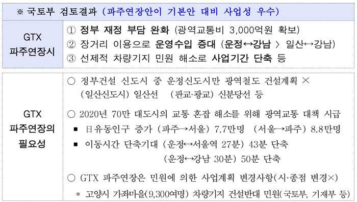 그러나, 국토부와 기재부는 GTX 파주연장의 타당성이 충분한데도 파주연장시 시·종점 변경 이라는 이유로 파주를 제외하고 GTX 기본계획을 수립하려 하고 있습니다.