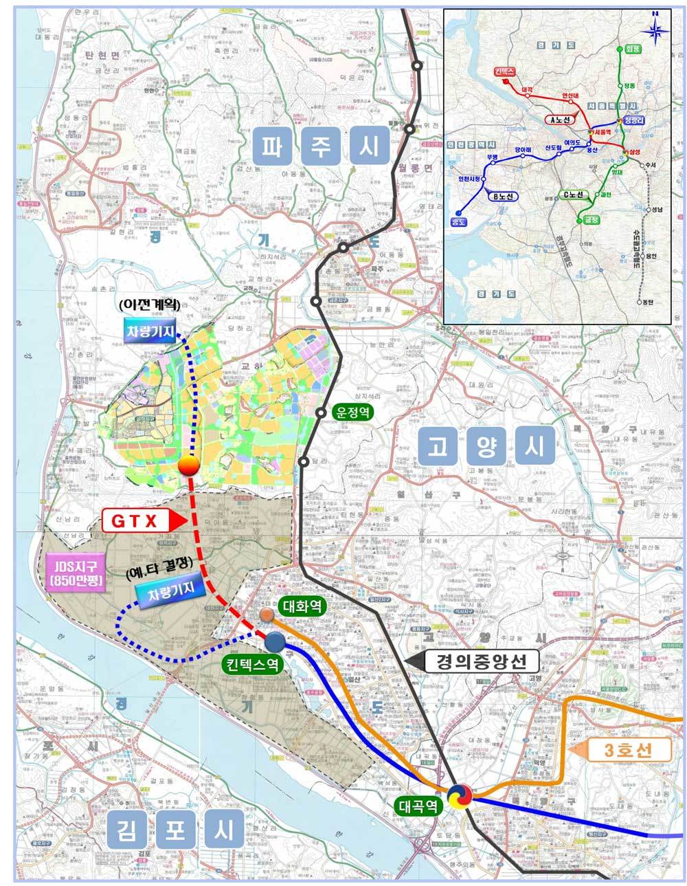 하지만, 수도권에 신도시를 조성하면서 입주민의 교통난을 해결하기 위해 대부분 광역철도를 새로 건설하였는데 오직 파주시 운정신도시에만 광역철도 건설 계획이 없습니다. 신도시사업자인 한국토지주택공사는 상업·업무용지가 분양되지 않아 11조7천억원의 적자와 하루에 4억4천만원의 이자를 내고 있는 상황입니다.