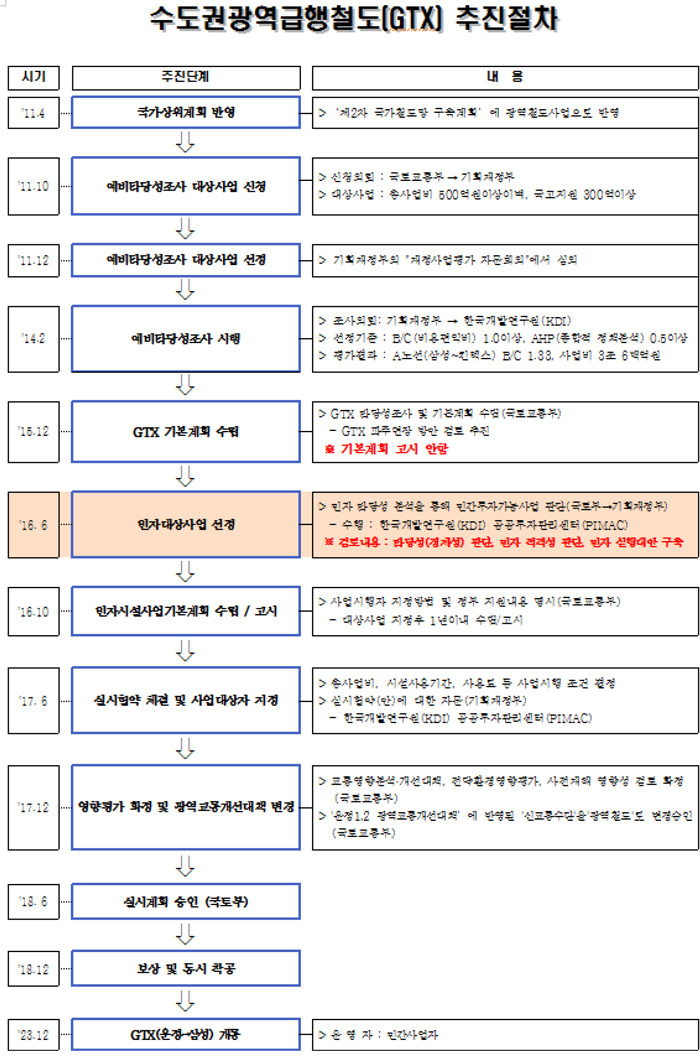 내년 하반기에 민자시설사업기본계획 고시 후 2017년 민간사업대상자를 지정하고 2018년 공사를 착공하여 2023년 개통할 계획이다.
