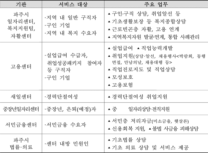 □ (참여기관) 파주시청 일자리정책팀, 일자리지원팀, 복지지원팀, 일자리센터, 자활센터(자치단체) 고용센터(고용부), 새일센터(여가부), 서민금융센터(금융위), 중장년일자리희망센터, 파주시 법률 및 경기북부 의료지원 서비스(한국산업간호협회)
