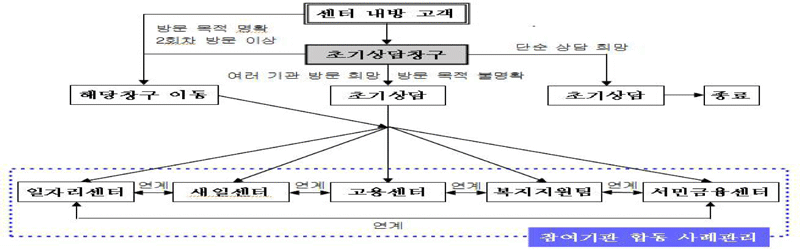 - ○ 기존의 고용센터에 위의 참여기관들의 기능을 One-Stop으로 제공하여 복합적인 어려움을 가진 시민들이 좀 더 편리하게 종합적이고 전문적인 고용-복지 연계 서비스를 받을 수 있게 했다.