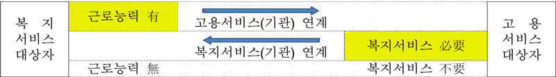 - * 예: 차상위계층 복지서비스를 통한 구직활동 지원, 취업성공패키지 등을 활용한 복지 수혜자의 탈수급 촉진, 구직활동 기간 가족간병(자녀돌봄) 서비스 제공 등