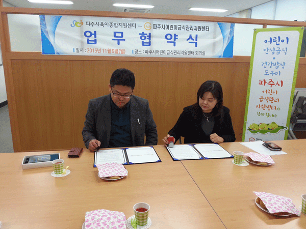 협약식은 파주시 어린이급식관리지원센터장과 파주시육아종합지원센터장을 포함, 관계자들이 참석한 가운데 파주시 어린이급식관리지원센터에서 열렸다.