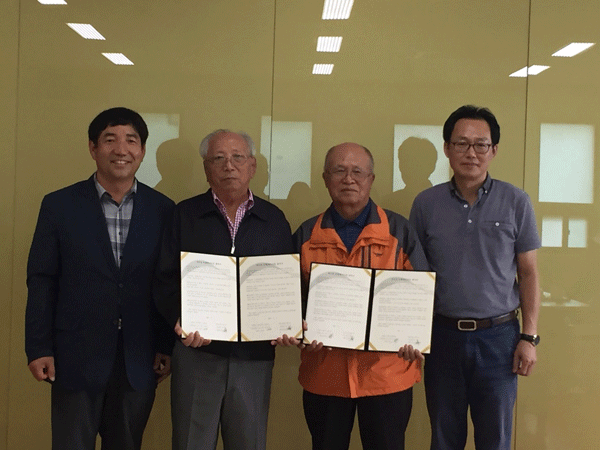 ▲ 교하동 주공2단지 경로당 (왼쪽부터 교하동장, 교하주공2단지경로당 김한수 회장, 신촌리경로당 김주삼 회장, 컴온커뮤니케이션 대표 이종호)
