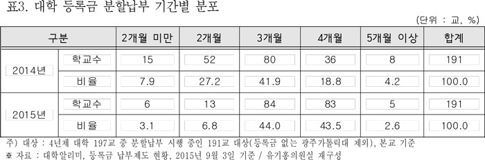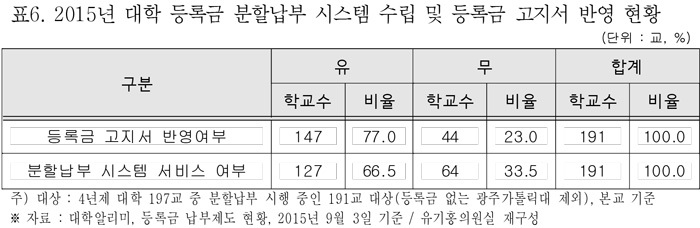 ○ 국회 교육문화체육관광위원회 유기홍 의원(새정치민주연합, 서울 관악갑)이 교육부로부터 제출받은 ‘2014~2015년 대학 등록금 납부제도 현황’ 국정감사 자료를 분석한 결과 2015년 대학 등록금 분할납부제도 이용 학생수는 6만 2천명으로 전체 학생(182만 명)의 3.4%에 그친 것으로 드러났다. 유기홍 의원은 “신ㆍ편입생이 분할납부제를 이용할 수 없도록 한 대학이 137교(71.7%)에 달하고, 장학금 수혜자 또한 분할납부제를 이용할 수 없는 대학이 3곳 중 1곳에 달하는 등 여전히 분할납부제 신청 장벽이 높기 때문”이라고 이유를 설명했다.