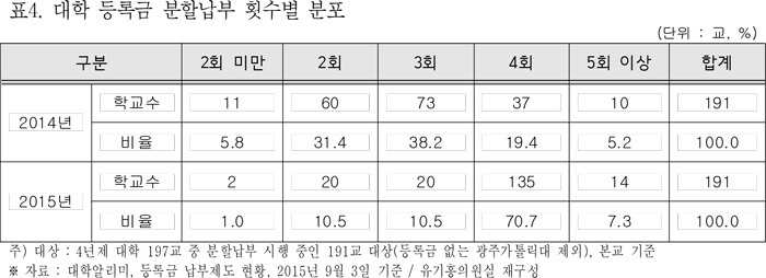 ○ 2015년 대학별 등록금 분할납부 가능 기간과 횟수는 2014년에 비해 상당히 개선된 것으로 나타났다. 등록금 분할납부 기간의 경우, 2개월 이하(2개월 미만 + 2개월)는 2014년 67교(35.1%)에서 2015년 19교(9.9%)로 대폭 줄어들었고, 분할납부 기간이 4개월인 대학은 2014년 36교(18.8%)에서 2015년 83교(43.5%)로 늘어나는 등 대다수 대학이 분할납부 기간을 확대했다. 등록금 분할납부 횟수 또한 2014년 3회 이하인 대학이 144교(75.4%)로 대부분이었으나, 2015년에는 4회 이상인 대학이 149교(78.0%)로 상당히 개선된 것으로 나타났다.