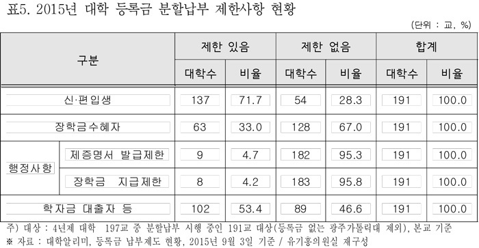 ○ 2015년 등록금 분할납부 시행 대학(191교) 중 신ㆍ편입생이 분할납부를 신청할 수 없도록 한 대학은 137교(71.7%)에 달했다. 입학 후 학생 이탈 등을 우려해 입학 학기 등록금은 분할해 받기 어렵다는 것이 주된 이유라 할 수 있다. 교육부 조차도 개선안에서 분할납부제 이용제한을 입학 학기(신ㆍ편입생)의 학생에게는 적용할 수 있도록 했다.