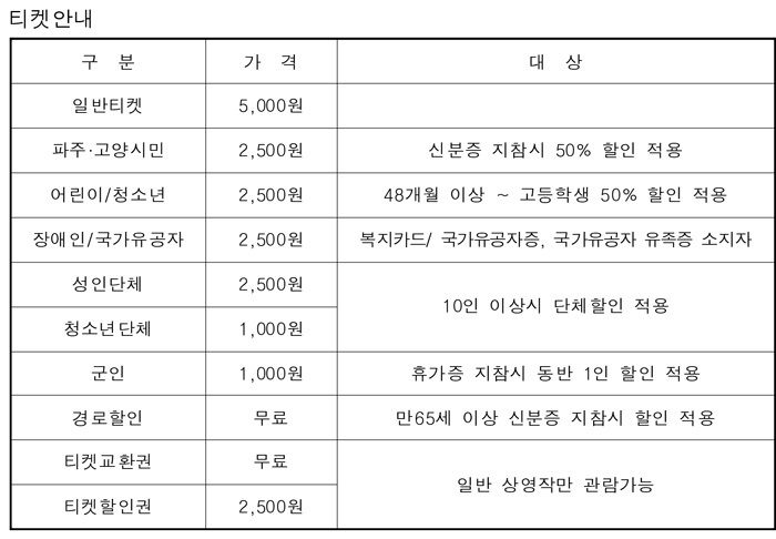또한 신분증 지참 후 만65세 이상일 경우 무료로 메가박스 출판도시점에서 영화 관람이 가능하며, 파주시민일 경우에는 50%할인되어 2,500원에 이용할 수 있다. 만65세 이상 어르신 20명 이상 ~ 30명 이하일 경우에는 전화문의 후 왕복셔틀버스 이용이 가능하다.