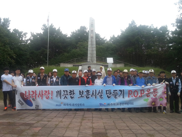 체계적인 시민 참여와 분위기 조성을 통해 시민과 함께하는 ‘깨끗하고 안전한 파주’를 실현하고자 시행한 2015년 파주사랑 POP운동의 일환으로 파주시는 ‘나라사랑! 깨끗한 보훈시설만들기’를 추진하고 있으며, 그 첫 행사로 지난 9월 5일 토요일 파주시청 공무원과 보훈단체 회원 총 70여명이 현충탑 및 학령산 주변 청결활동을 실시했다.