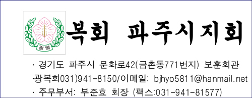 □ 광복회파주시지회(회장 부준효)는 광복 70주년 광복절 경축식과 패전 70주년을 맞아 발표될 예정인 일본의 ‘아베담화’를 앞둔 오늘(13일) 성명을 발표했다.