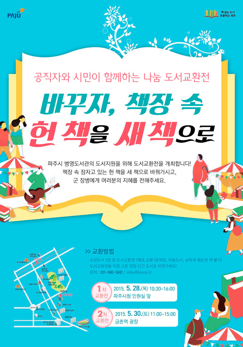 도서교환전과 관련된 자세한 사항은 책읽는 파주 홈페이지(pajulib.or.kr)나 전화(☎031-940-5042)로 문의하면 된다.