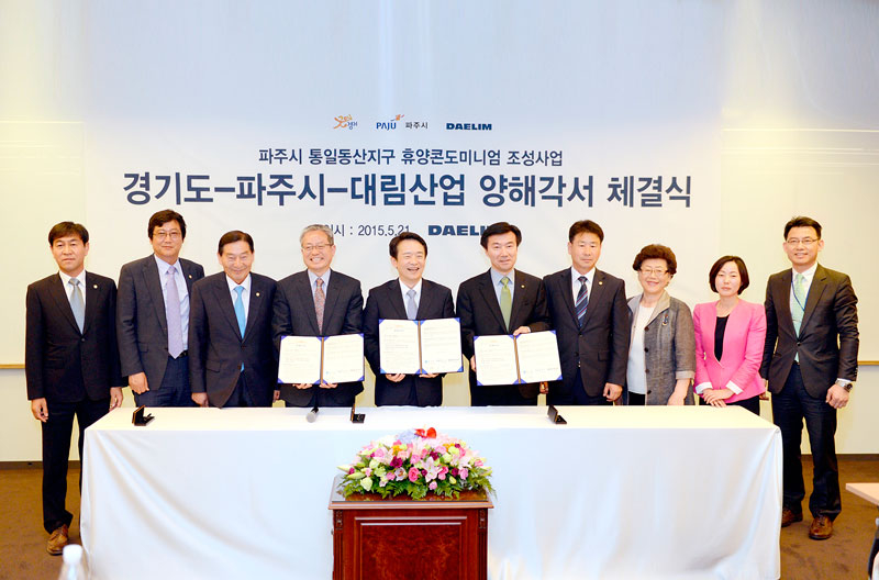 남경필 경기도지사와 이재홍 파주시장, 김한기 대림산업(주) 사장은 21일 오전 10시 대림산업(주) 본사에서 ‘파주 통일동산 휴양콘도미니엄 조성사업 양해각서’에 서명하고 향후 사업의 정상화 추진을 위하여 3개 기관이 공동 협력하기로 했다.