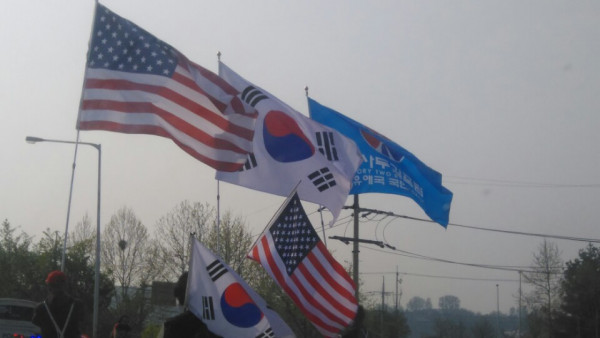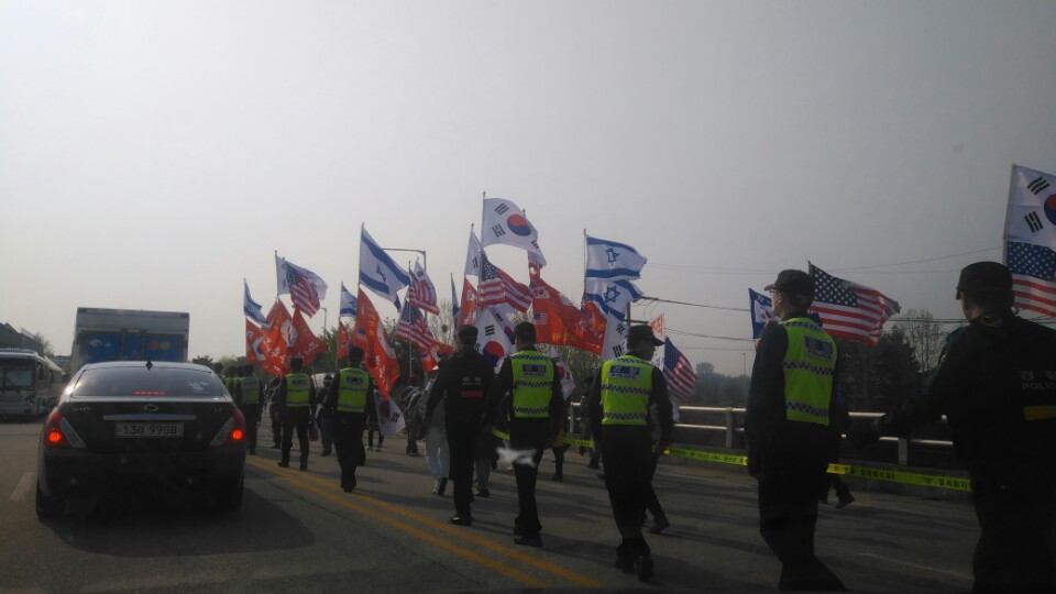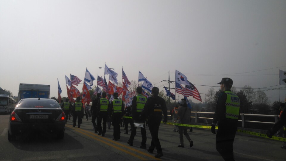[ 남북정상회담 이모저모] 임진각에 뜬 배트맨도 궁금하다 통일대교에서 문산 서울로 향하는 길목이 통제되고 있었다. 영문을 모르는 민통선 안의 농민들 및 관광객들이 차에서 내리는 등 일대는 혼잡을 이뤘다.관광객으로 보이는 한 외국인은 태극기 부대의 행렬을 보며 'why?'를 연신 외쳤으며 일부 농민들은 경찰에 항의하는 등 소란은 이들의 행렬이 이어지는 동안 계속됐다. 이 행렬은 '태극기 혁명 국민운동본부' 소속으로 '김,문 판문점 회담 평화 위장 대 사기'라는 플랜카드를 걸고 임진각을 향하고 있었다. 주성임 기자