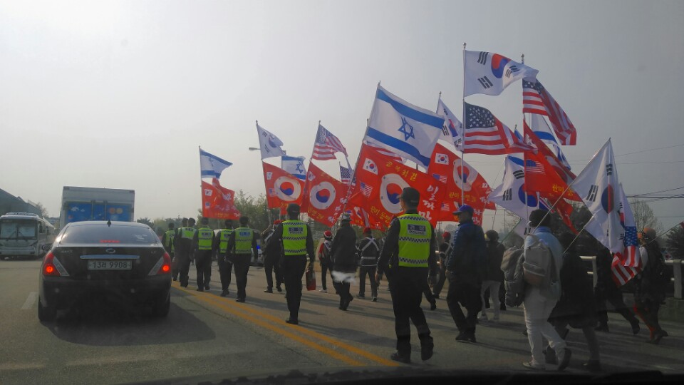 남북정상회담이 열리고 있는 시간인 4시 전후, 임진각과 통일대교로 가는 마정삼거리(자유IC)에서 태극기부대 100여명이 집회를 하는 바람에 교통이 마비되고 있다. 통일대교를 넘어서 자유로나 문산쪽으로 나가려는 시민들이 태극기부대 집회로 길이 막히는 일이 발생하자 이해할 수 없다는 반응을 보이고 있다. 이들 태극기 부대는 ‘태극기혁명 국민운동 본부’ 이름의 ‘4.27 문*김 판문점 회담 평화위장 대사기’라는 현수막을 내걸고 임진각으로 행진을 했다.