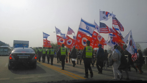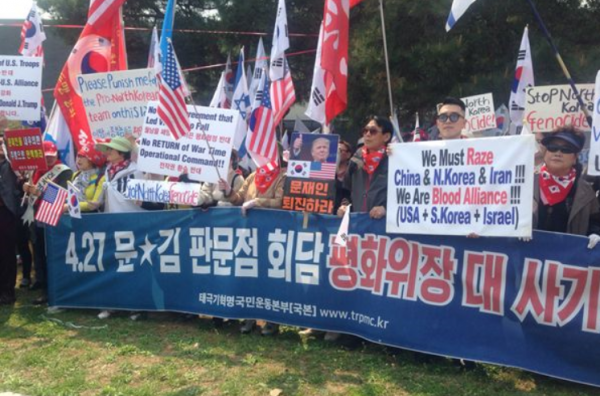 이 자리에 있던 박모씨는 “민족과 세계인의 염원이 담긴 남북정상회담을 반대하는 사람들이 시위를 하고 있어 기가 차다”고 말했다. 주모씨는 “지나가는 외국인이 왜 저러냐고 묻는데 창피해서 혼났다”며, “이 사람들은 남과 북이 계속 싸우길 바라는건지...이해할 수 없다.”고 말했다. 태극기 부대 일원들은 버스통행이 통제되자, 도보로 임진각으로 행진하고 있다.