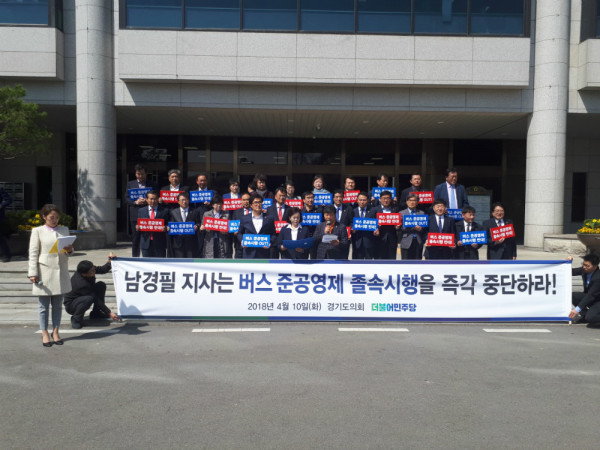 경기도의회 더불어민주당(대표직무대행 윤재우)은 4월 10일(화) 의원총회가 끝난 후 의회 정문 앞에서 진행된 집회를 통해 “경기도는 광역버스준공영제 졸속시행을 중단하고, 충분한 준비를 통해 제대로 시행하라”고 촉구했다.