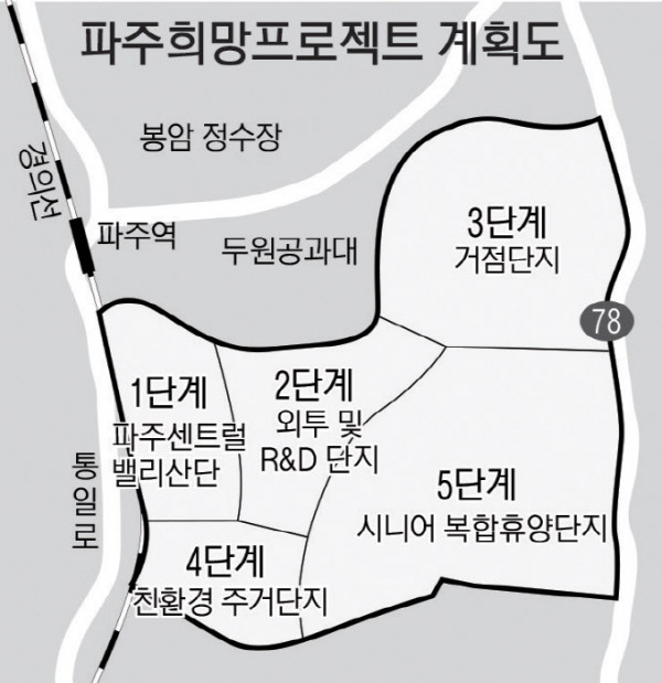 파주희망프로젝트는 1단계 파주센트럴밸리산단, 2단계 외투 및 R&D단지, 3단계 거점단지(데이터 센터등), 4단계 친환경 거주단지 및 5단계 시니어 복합휴양단지로 조성된다.