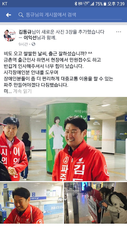 ❍ 김동규 파주시장 예비후보가 비 오는 이른 아침 금촌역에 나와 시민과 대화의 나서는 등 본격 활동의 나서고 있다.
