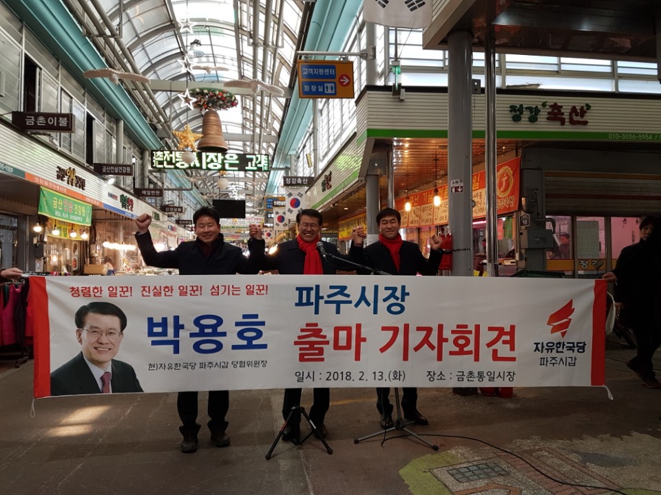 자유한국당 박용호(54) 파주시 갑 당협 위원장이 2월 13일 금촌전통시장에서 파주시장 출마를 선언했다. 박위원장은 청렴하고 기업하기 좋은 도시 파주를 만들 적임자임을 강조하며 4차산업 혁명의 전진기지, 대한민국의 중추도시가 될 파주임을 강조하였다. 청년들과 소외계층, 중산층과 서민들의 일자리 창출은 물론 시장 민생 경제의 할성화에 시정을 집중하겠다고 포부를 밝혔다.