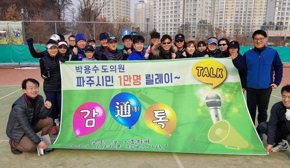 박용수 도의원은 지난 1월 6일부터 광탄면 신산 2리 마을회관에서 ‘1만 명 파주시민 릴레이토크 감통톡’ 프로젝트를 시작해 22일 현재 6차 감통톡까지 진행, 본격적인 지방선거 활동에 나섰다는 평가이다. 박용수도의원은 첫 감통톡으로 신산 2리 주민을 만나, 버스노선, 신산초 통학로 문제 등의 애로를 들었고, 두 번째로는 운정체육공원에서 위너스테니스클럽 회원들을 만나 야간조명과 펜스와 샤워시설 등의 민원을 들었다. 박용수 도의원은“자신의 감통톡 릴레이에 대해 다른 의원들이 벤치마킹을 할 정도로 반응이 좋다”며 “앞으로도 파주시민을 직접 찾아가 마음이 통하는 만남을 하고, 감동하는 정치를 할 것”이라고 말했다. 박용수 도의원은 다가오는 지방선거에서 시장후보로 나설 계획이다.