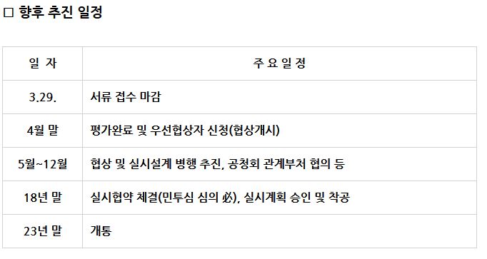 4월말 우선협상자를 선정하고 이후 협상을 개시, 공청회와 관계부처 협의 등을 거쳐 2018년 말 실시협약체결과 실시계획 승인 및 착공에 들어가, 2023년말 개통을 목표로 하고 있다.