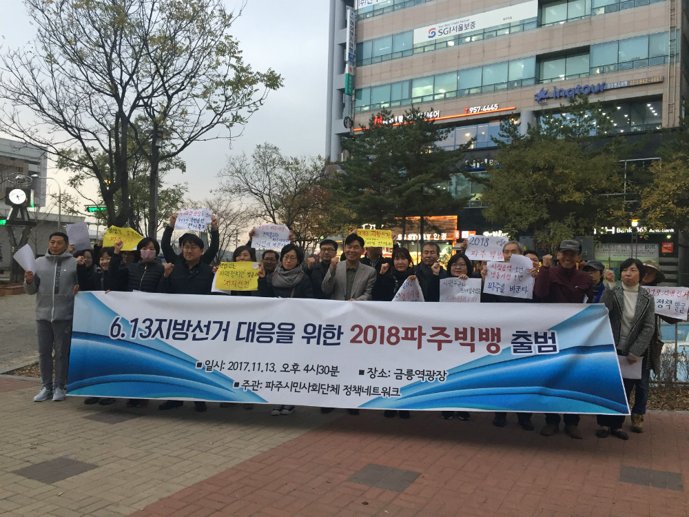 지난 11월 13일 금릉역 앞 중앙 공원에서 ‘6.13 지방선거 대응을 위한 2018 파주빅뱅(가칭)(이하 파주빅뱅)’출범을 알리고, ‘파주 변화를 위한 1000인 선언’기자회견을 하였다.