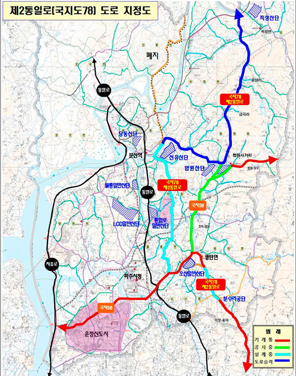 국토교통부가 지난 13일 국지도 78호선의 일부 노선을 지정 변경하고 도로 승격을 확정하는 고시문(2016-453호)을 발표했다. 제2통일로 사업은 기존 국지도 78호선 구간 중 국지도 기능을 상실한 민통선 지역 노선을 폐지하고, 도로 등급 조정을 통해 문산 선유리~ 적성 두지리 지방도 노선의 등급을 국지도로 조정하는 사업이다.