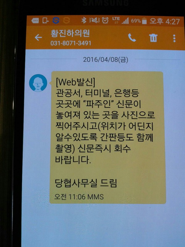 그러나 황진하 캠프에서 파주인 신문을 회수하라는 문자를 뿌리고 신문을 무단 절취를 해갔다는 것. 파주인 신문사는 “황진하 후보의 선거운동원들이 모 산악회에 돈 봉투를 전달한 사실이 밝혀지고, 이를 우리 신문이 보도하자, 황진하 후보 측은 우리 신문을 무단으로 절취해서 가져가는가하면, 자신이 속한 당원협의회에서는 우리 신문을 보는 대로 ‘회수’하라는 문자 지시를 공공연히 내렸다.”고 주장하고 있다. 또한 “선거법에서는 선거운동원의 불법적인 행위도 책임을 후보자에게 묻고 있다. 본인이 돈을 주지 않았다고 해서 법적인 처벌을 피할 수는 없다.”면서 나아가, “당원들에게 공공연히 불법을 저지르라고 교사한 것”을
