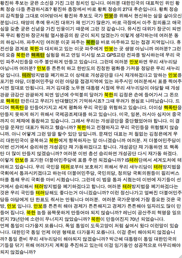 ▲김무성 새누리 대표최고위원의 연설문. 안보 위기 상황을 강조
