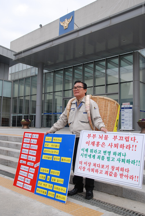 ▲구국실천연대 상임대표가 파주경찰서에서 이재홍 파주시장을 규탄하는 1인 시위를 하고 있다.