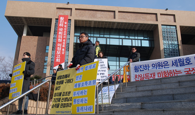 12월 22일 파주시민회관 대강당 앞에서 ‘황진하 의원 세월호 특조위 폄훼 망언 및 국정화 추진 규탄 집회’가 열렸다. 황진하 국회의원(파주을, 새누리당 사무총장)은 지난달 20일 국회에서 진행된 새누리당 원내대책회의에 참석하여 “많은 국민이 세월호 특조위가 뭣 하러 존재하는지 궁금해한다. 정치 집단처럼 대통령 행적조사를 하겠다는 발상 자체가 특조위 기본 행위를 망각한 것”이라고 말한 바 있다.