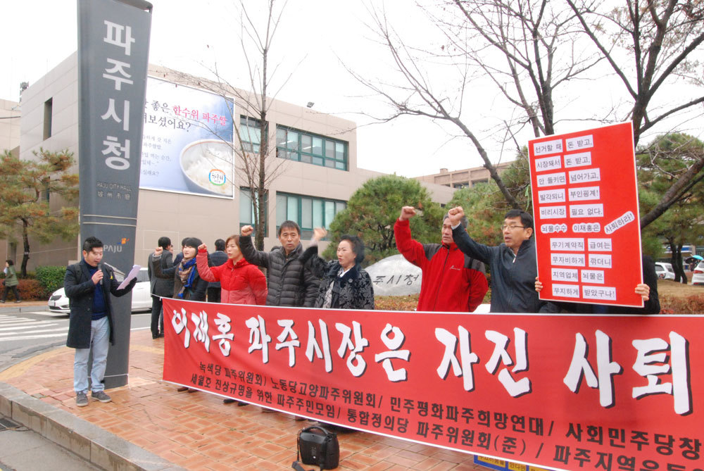 11월 25일 수요일 11시 파주시청 앞에서 <이재홍 파주시장 비리 진상규명 공동대책위원회>는 이재홍 파주시장의 자진사퇴를 촉구하는 내용의 기자회견을 열었다.
