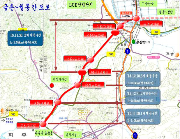 11월 30일 지방도 360호선 금촌~월롱 구간이 왕복 4차선으로 오는 30일 개통됐다. 이번에 개통된 구간은 덕은교차로~봉암램프 2.58km이며, 전구간 개통은 착공한 지 10년 만으로 사업비는 총 1157억원이 투입됐다. 시는 문산~월롱 전 구간이 개통됨에 따라 사고위험 감소와 상습정체 해소 등 교통난이 해결될 것으로 전망하고 있다.