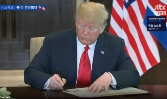 서명을 하면서 "북 비핵화 절차, 매우 빨리 시작될 것이다." "좋은 만남이었고 앞으로 많은 일을 할 것이다." "그 누구도 예측 못한 아주 좋은 협상이었다. 김위원장은 대단히 재능이 많은 사람인 걸 알게 되었다. 중대한 유대의 끈 맺었다"라고 말했다. "한반도의 모든 관계가 예전과는 완전히 달라지게 될 것이다. 비핵화 즉각적인 시작을 할 것이다." 라고 전했다.