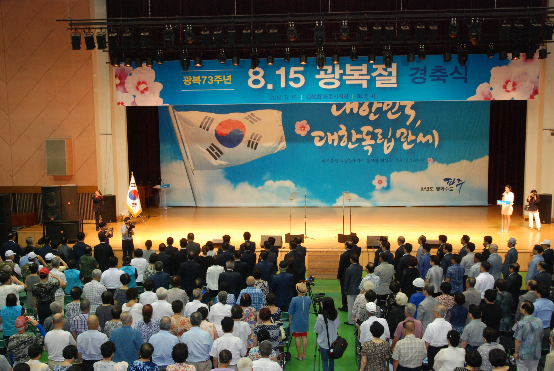 파주시와 광복회파주지부는 8월 15일 11시 제73주년 광복절을 맞아 시민회관 대공연장에서 광복회원 및 보훈단체, 사할린 영주 귀국자 등의 시민과 군인, 학생 등 약 1,500여 명이 참석한 가운데 기념식을 개최했다.