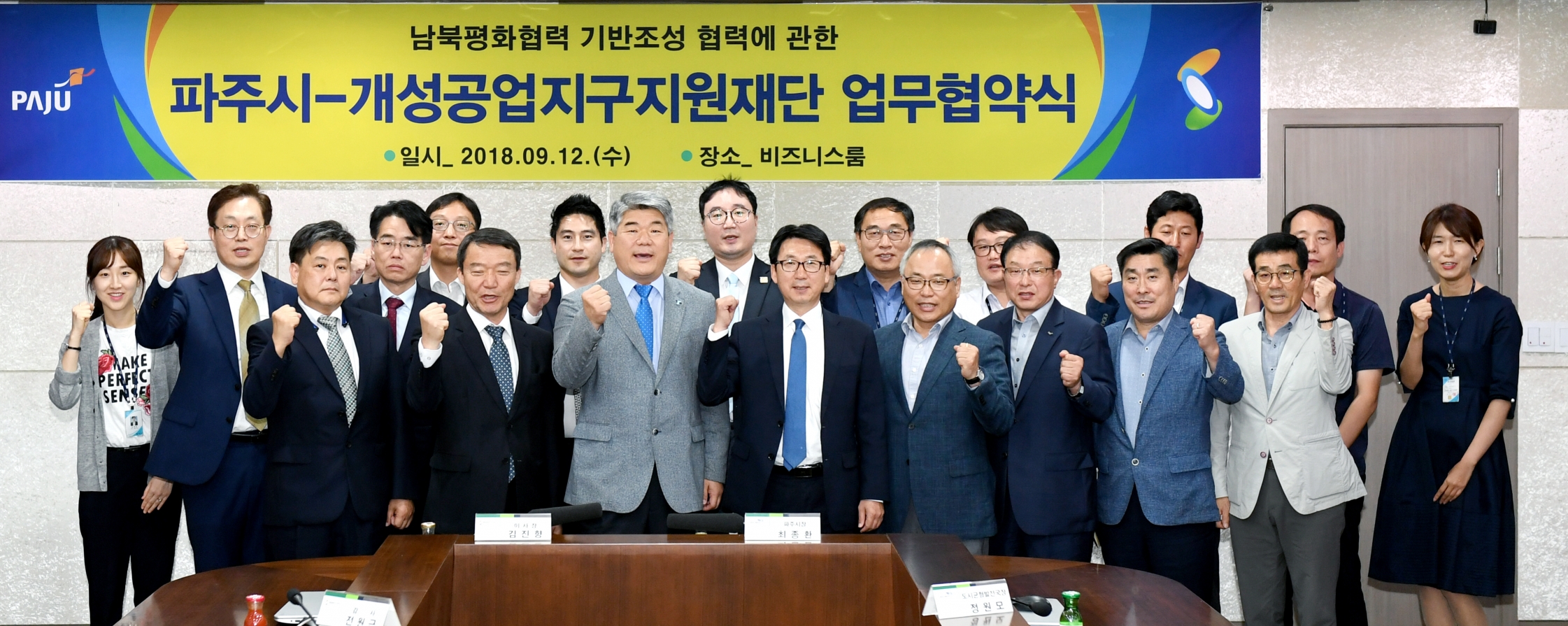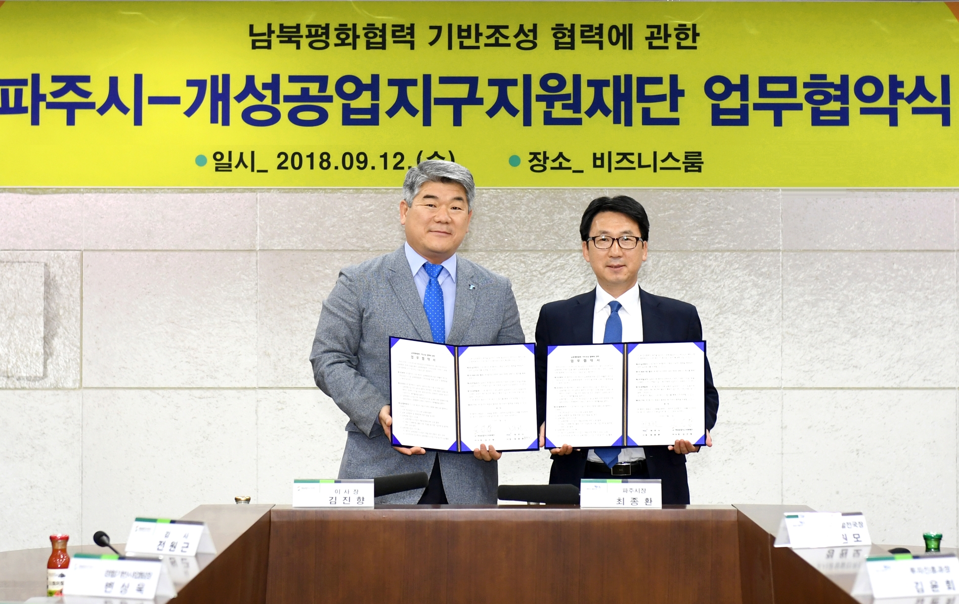파주시는 12일 파주시청 비즈니스룸에서 개성공업지구지원재단과 남북평화협력 기반조성 상호협력을 위한 업무협약을 체결했다.