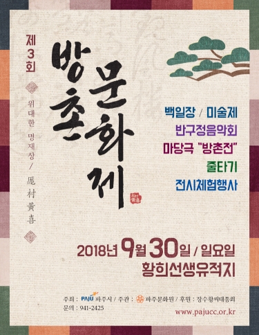최종환 파주시장은 “황희선생 유적지에서 개최되는 방촌문화제는 황희선생의 생애를 돌아보고 파주가 생태문화역사 자원이 풍부한 고장임을 널리 알리는 기회가 될 것”이라고 말했다.