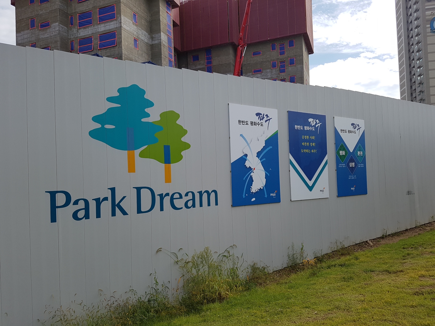 최종환 파주시장의 민선7기 시정 비전이 ‘한반도 평화수도 파주’로 정해지면서 아파트 현장의 경계 가설펜스에도 새로운 디자인의 이미지를 도입해 적용했다.