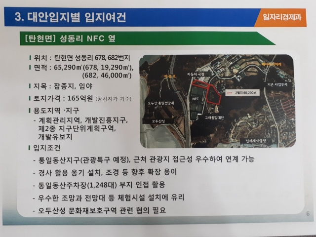 ‘시민공론화추진단’은 적성 두지리, 파평 율곡 습지공원, 문산 임진각, 탄현 성동리 NFC옆, 탄현 성동사거리 등 5곳의 후보지를 답사한 후 각 단체 대표 14명이 모인 자리에서 결정하였다. 성동리 NFC옆(성동리 678,682번지)자리는 65,290m²크기의 잡종지, 임야로 공시지가기준 토지매입비가 165억원으로 알려졌다. 이곳은 관광특구로 예정되어 있는 통일동산지구이면서, 조경등 향후 확장이 용이하고, 우수한 조망과 전망대 등 체험시설 설치에 유리하다는 평가를 받아 선정된 것으로 알려졌다.