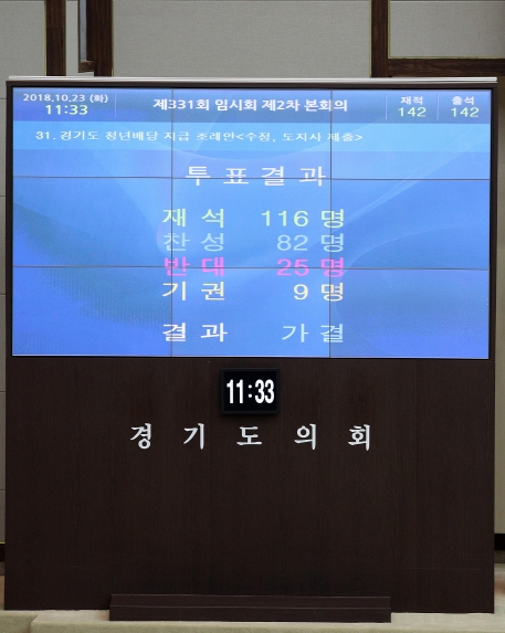 통과된 주요 조례안을 살펴보면 먼저 경기도 청년배당 지급 조례안은 도내에 3년 이상 거주 중인 만 24세 청년을 대상으로 분기별 25만 원씩 연간 100만 원상당의 지역화폐를 지급하는 내용을 담고 있다. 이에 따라 내년에 만 24세가 되는 17만5천여명이 청년배당을 받을 것으로 도는 추산하고 있다.