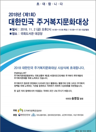 대한민국 주거복지문화대상은 주거복지공동체를 만들기 위해 노력하는 단체및 기관과 주거복지를 실천하는 시민에게 주는 상으로 올해 처음 시행됐다. 시민단체인 주거복지문화운동본부가 주최하고 행정안전부와 국회 국토교통위원회, 문화체육관광위원회, 보건복지위원회, 여성가족위원회가 후원한다.