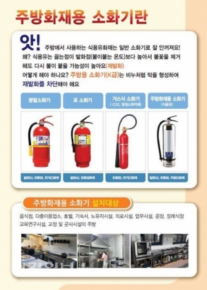 지난해 4월 소화기구․자동소화장치의 화재안전기준(NFSC 101) 개정에 따라 다중이용업소, 음식점 등의 주방 25㎡ 미만에는 K급 소화기 1대, 25㎡ 이상인 곳에는 K급 소화기 1대와 25㎡ 마다 분말 소화기를 추가 의무적으로 비치해야 한다.