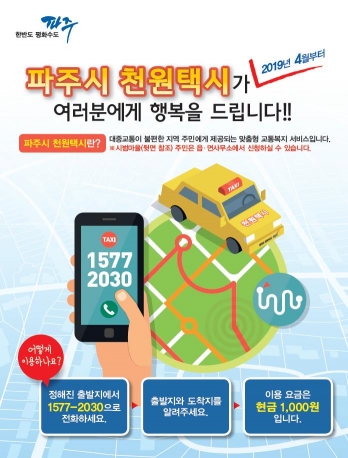 파주시는 천원택시 사업도 추진하고 있다. 천원택시 사업은 민선7기 공약사항 중 하나로 대중교통이 불편한 주민들에게 천원의 요금으로 대중교통이 편리한 지역까지 이동을 도와 도심 지역의 복지·문화 서비스를 누리게끔 하는 것이다. 월롱면 능산리 외 7개 지역에 시범 운영하고, 올해 상반기 결산을 통해 예산이 확보되면 추가 마을 선정도 검토할 예정이다.