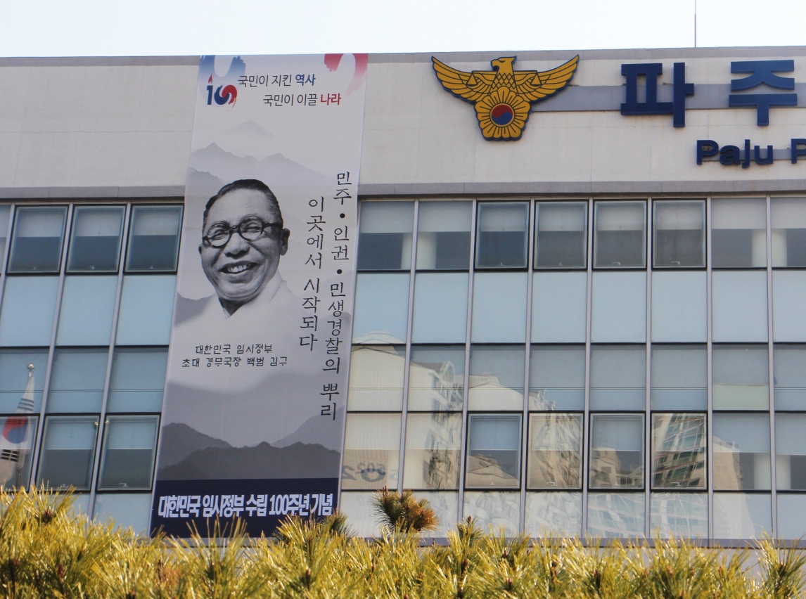 파주경찰서(서장 이철민)는 3월 14일 경찰서 본관 외벽에 대한민국 임시정부 100주년을 기념하여 초대 경무국장인 백범 김구 선생의 숭고한 애국심을 널리 알리기 위해 대형 현수막을 게시하였다.