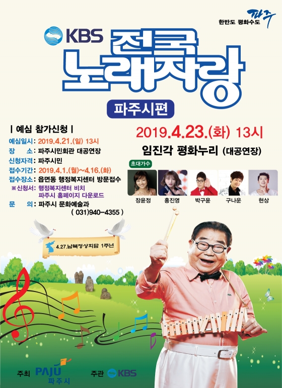 방송출연자를 가리기 위한 예선은 4월 21일 파주시 시민회관 대공연장에서 진행될 예정이며 파주시 거주자와 관내 기업체, 학생 등을 대상으로 4월 1일부터 4월 16일까지 읍·면·동 행정복지센터에서 참가신청서를 받는다.