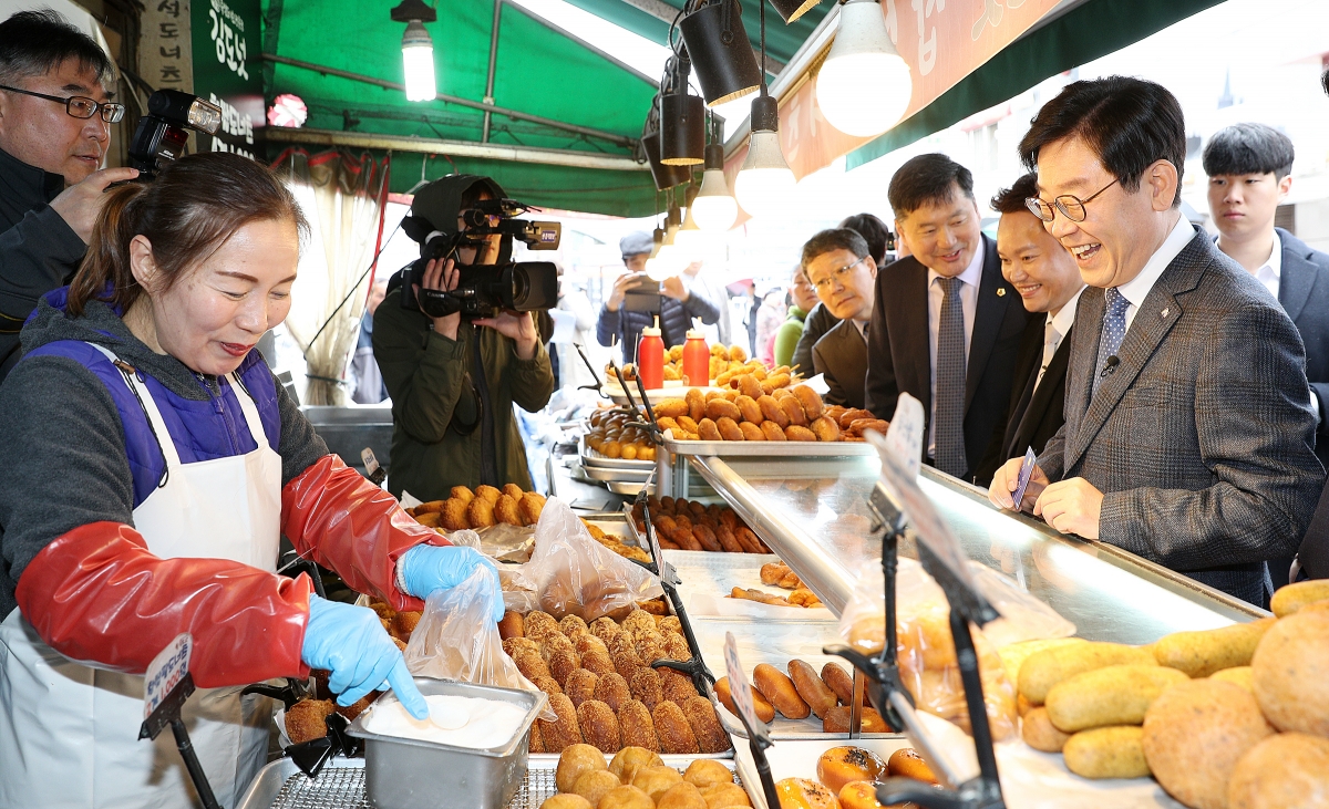 이재명 도지사가 10일 수원 남문시장을 방문해 도민들과 대화를 나누며 경기지역화폐를 홍보했다.
