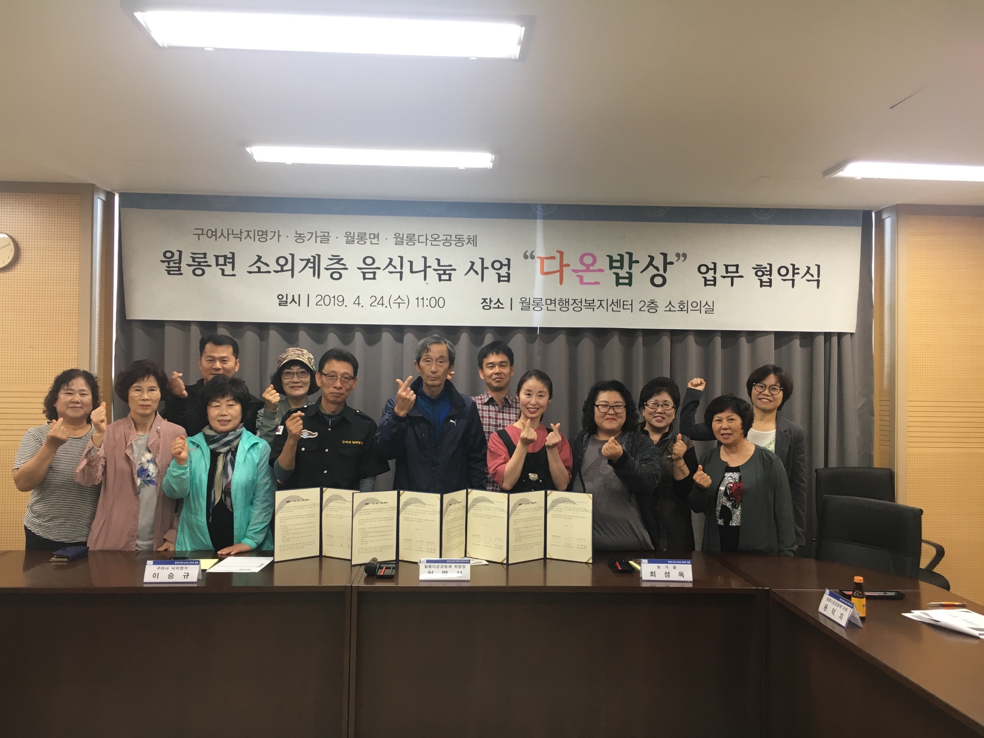파주시 월롱면은 지난 24일 월롱다온공동체(위원장 천명섭)와 함께 농가골(대표 최성옥), 구여사낙지명가(대표 이승규)와 ‘다온밥상’ 협약을 체결해 관내 독거노인과 장애인 가구를 위해 월 40인분의 음식을 정기적으로 후원한다.