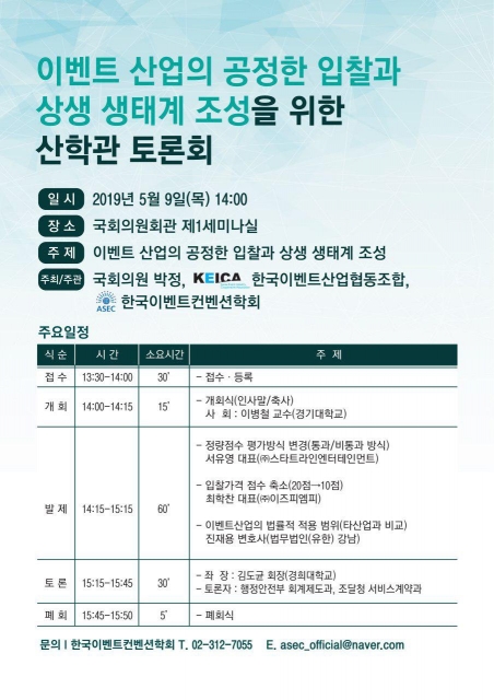 토론에는 김도균 한국이벤트컨벤션학회 회장이 좌장을 맡고 최교신 행안부 계약팀장, 박철웅 조달청 서비스계약과장이 참여한다.